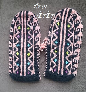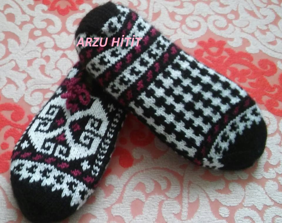 Ben 38 numaraya göre ördüm. Çetiğin ön kısmında 4 kez ajur modeli uyguladım. Ayağınız çok büyükse ajur modellerinin sayısını 5'e çıkartabilirsiniz. İki renkle ördüm. Dilerseniz tek renkle örebilirsiniz.